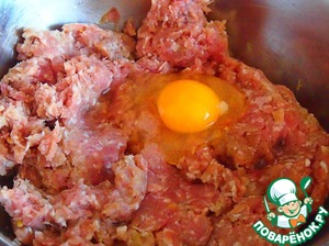 Мясо готовится, как на обычные котлеты. В фарш добавить измельченный лук и продавленный чеснок. Добавить яйцо, соль и перец, размешать. Добавить молотые сухари или размоченную в воде вчерашнюю булку и неострую горчицу. Фарш тщательно вымесить. Это очень важно, чтобы фарш представлял собой однородную пластичную массу, иначе рулет в процессе выпечки потрескается.