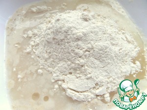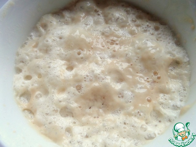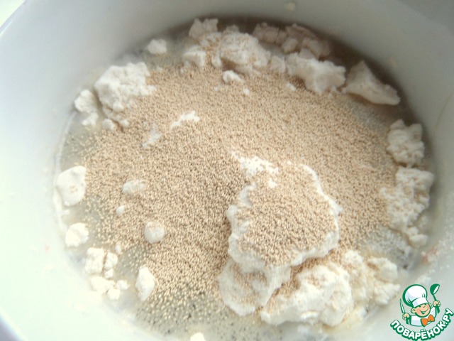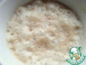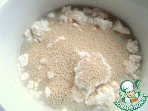 В половине воды и ложке муки размешать дрожжи с сахаром.