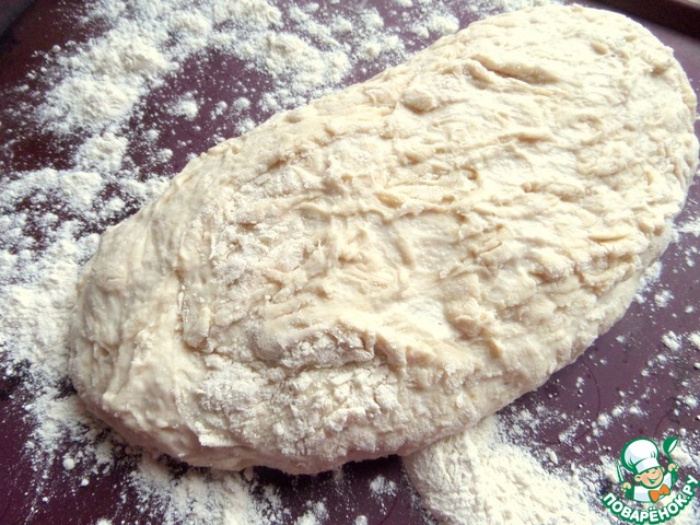 Выгрузила с помощью лопатки тесто на стол с мукой, вернее на силиконовый коврик.