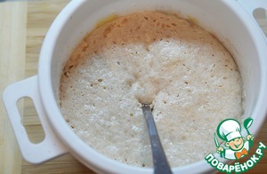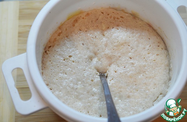 Смешайте все ингредиенты для опары, поставьте в теплое место и дождитесь её увеличения.