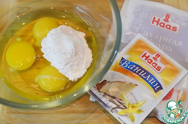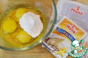Яйца взбейте с сахарной пудрой и ванилином.