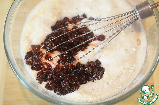Творог разотрите, добавьте растопленное сливочное масло, взбитые яйца, опару, соль, изюм.