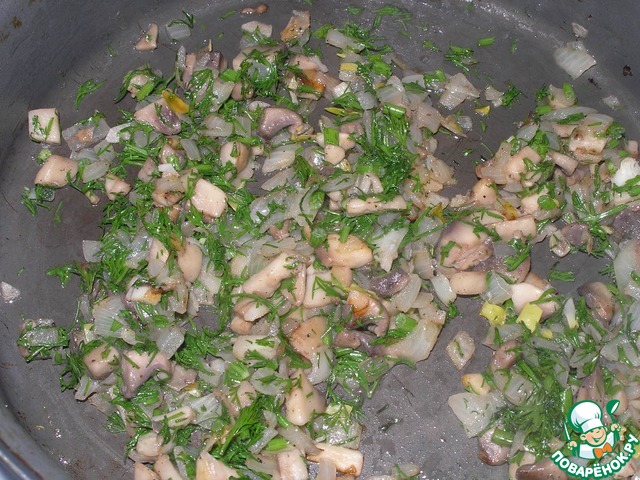 Грибы с луком обжариваю до румяности, добавляю сюда же мелко порезанный укроп.