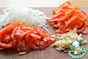 Помидоры, лук и перец нарезать полукольцами. Чеснок порубить.