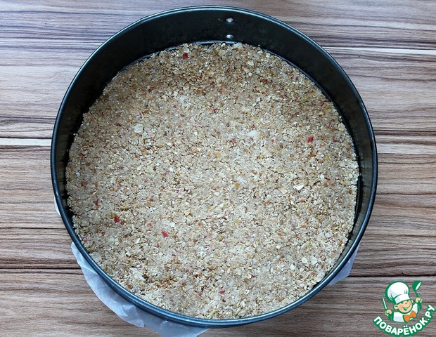 Дно разъемной формы (18-22 см) застелить пергаментом, бока смазать растительным маслом. Выложить массу и разровнять.