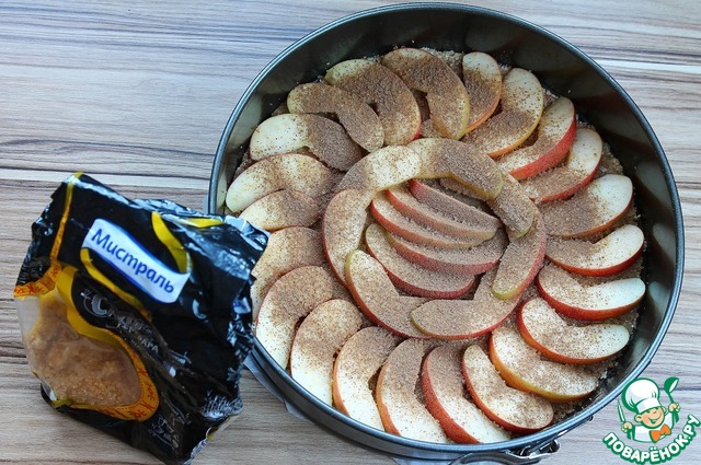 Два яблока нарезать на дольки и уложить на массу. Присыпать сахаром и корицей.