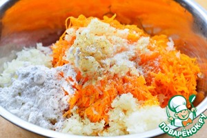 • Мясной фарш (курица/говядина), тыкву и лук выложить в чашу, добавить крахмал (картофельный или кукурузный), посолить. Тщательно перемешать фарш.