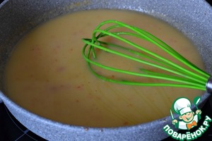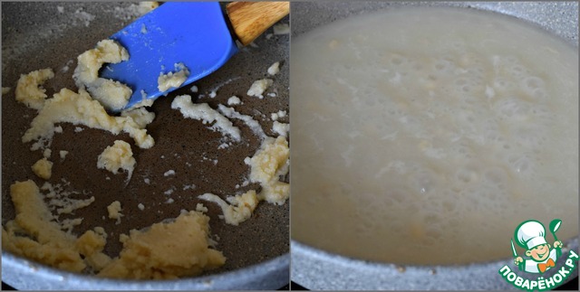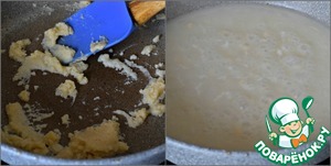 • Растительное масло разогреть в сковороде, всыпать муку и обжарить муку до карамельного цвета, постоянно мешая.