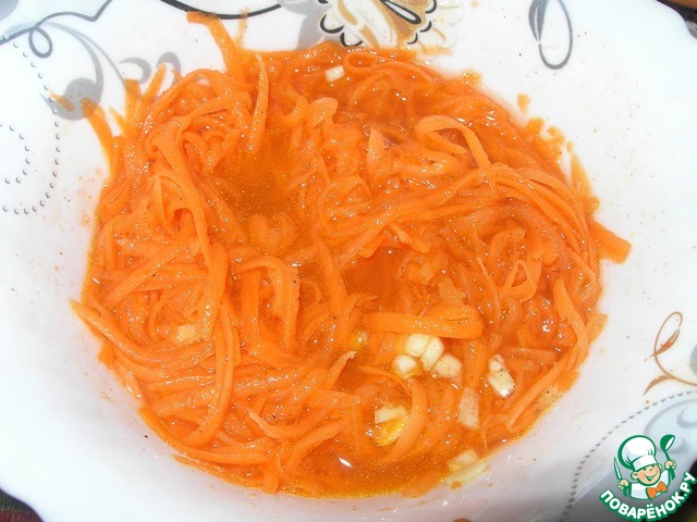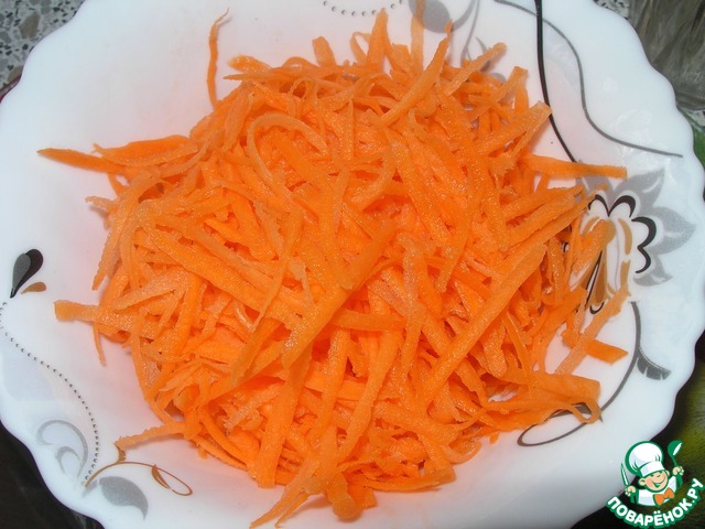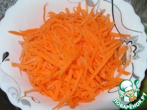 Натираю крупную морковь на тёрке для корейской моркови или нарезать тонкой соломкой.