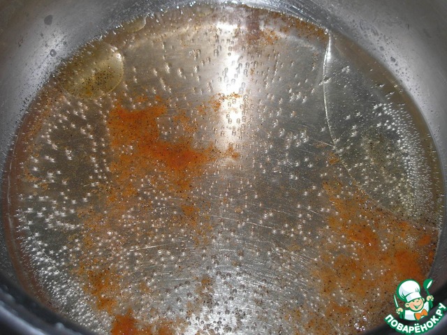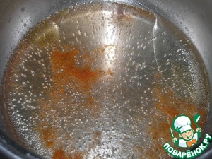 Приготовить маринад для моркови: в 100 мл воды растворить 1 ч. л. сахара, 0,5 ч. л. соли (можно чуть меньше), добавить сюда же 1 ст. л. растительного масла, мелко нарезанный 1 зубочек чеснока, молотый острый черный перец и сладкую молотую паприку по вкусу. Всё тщательно перемешать, на среднем огне довести до кипения.