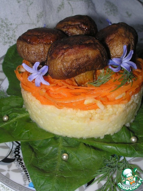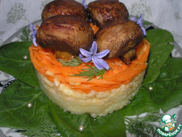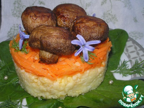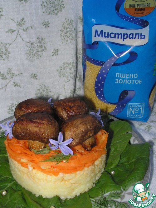 Пшено - питательный продукт, являющийся источником сложных углеводов, а растительные жиры, содержащиеся в нём ускоряют усвоение витаминов. Грибы, в свою очередь, самый белковый продукт. Поэтому мой рецепт прекрасно подойдёт для диетического питания. Абсолютно самостоятельное блюдо, которое при этом может выступать в роли закуски, гарнира или салата. Ароматно, пряно, пикантно, сытно, вкусно и при этом крайне полезно!!! Угощайтесь на здоровье!!!