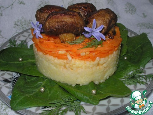 Теперь осталось только красиво подать. Для декора использую листья шпината и укроп. На шпинат первым слоем выкладываю с помощью салатной формы сваренное пшено, затем слой маринованной моркови (предварительно сливаю маринад в отдельную ёмкость). Как только морковный слой уложен, сверху добавить на него совсем немного маринада, чтобы он просочился на нижний слой пшена (тут важно не переборщить, иначе пшено не будет держать форму). Сверху кладу запечённые шампиньоны и маленькие веточки укропа.