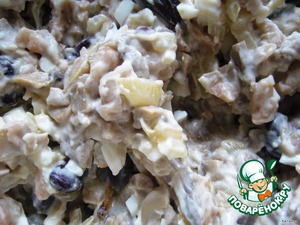 Смешиваем все ингредиенты (к этому времени лук, фасоль и грибы должны уже остыть), заправляем майонезом. Приятного аппетита!