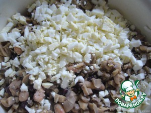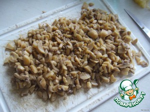 С грибов, как и с фасоли, сливаем воду, режем их чуть мельче, чем они есть в банке, и тоже подсушиваем на сковородке.