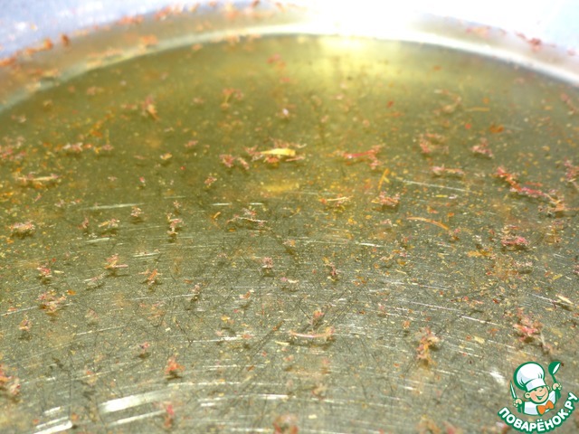 Нагреть сковороду на очень медленном огне, и жарить тычинки (1/3 ч. л.) постоянно помешивая 2 минуты до тех пор, пока шафран не приобретёт глубокий красный цвет. -