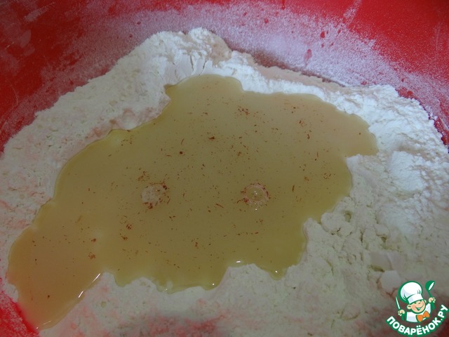 В остальную муку (315 грамм) добавить воду, дрожжи (я предварительно растворила дрожжи в воде), соль и влить настой шафрана, замесить тесто. -