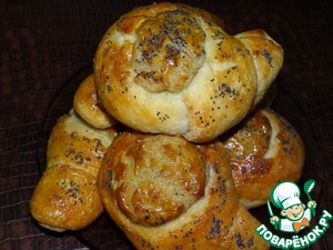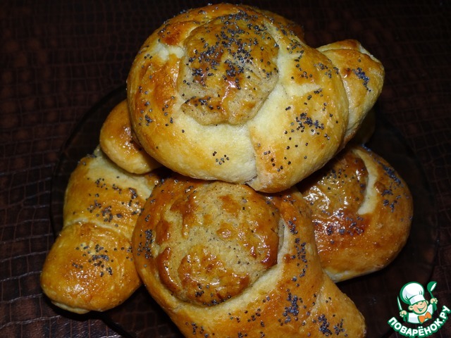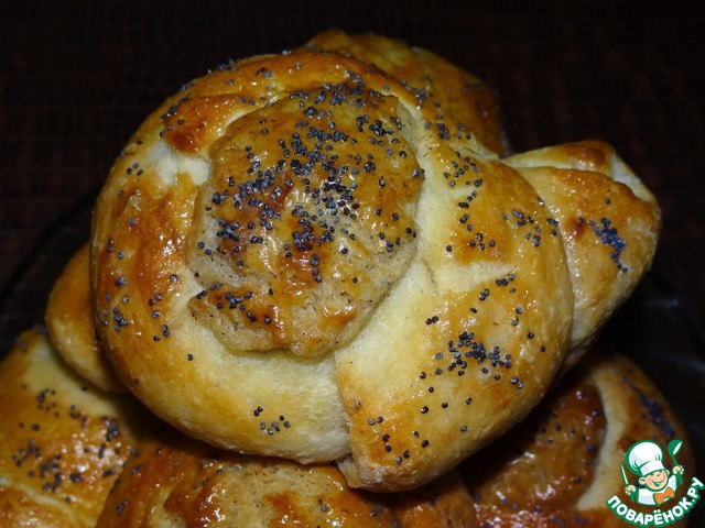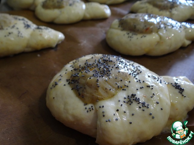 Начинку положить в середину лепёшки (по 1 чайной ложке с горкой), сверху смазать яйцом, взбитым с добавлением маленькой щепотки порошка шафрана, посыпать маком и выпекать в жарочном шкафу при температуре 200 градусов - 18 - 20 минут (в оригинале рецепта: 230 градусов - 25 минут).