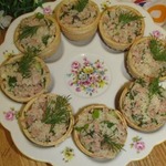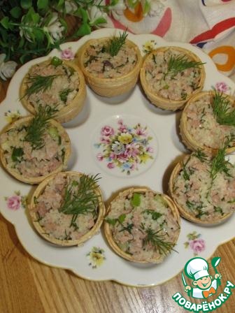 Смешать кус-кус с зеленью и печенью трески. Выложить в тарталетки. Украсить по желанию.