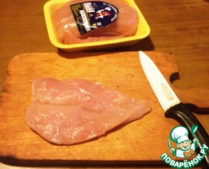 Куриное филе надрезать, раскрыть книжкой и отбить между пищевой плёнкой.