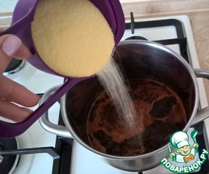 Тонкой струйкой, при постоянном помешивании, всыпать манную крупу. Хорошо размешать и выключить огонь.