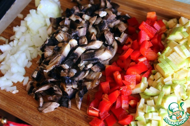 Мелко нарезать лук, чеснок, шампиньоны, болгарский перец, цукини. Обжарить до готовности, смешать с томатной пастой, посолить, поперчить.