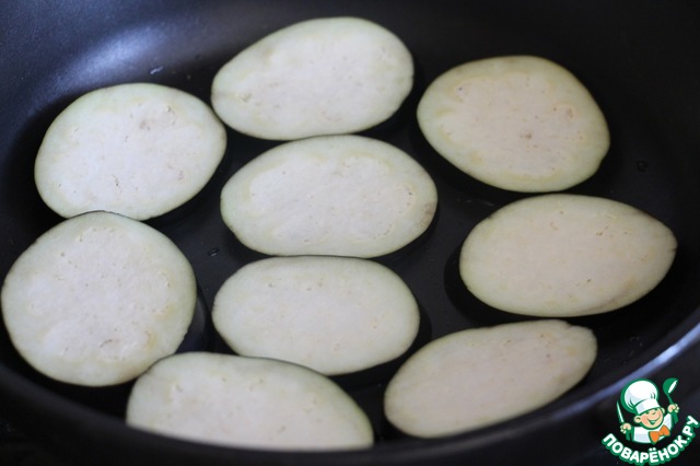 Баклажаны нарезать тонкими кружочками, присыпать солью и оставить на 10 минут, промыть, обсушить, обжарить на растительном масле.