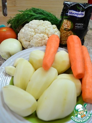 Картошку, морковь нарезать произвольно, добавить промытый горох продукция ТМ Мистраль Айдахо жёлтый колотый...