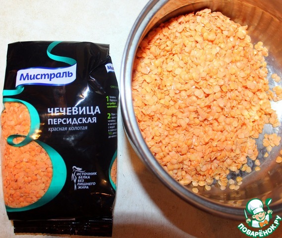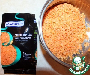Чечевицу Персидскую ТМ Мистраль замочить в холодной воде на ночь. Воду слить, чечевицу промыть.