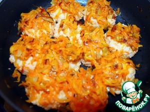 В массу добавить половину заранее обжаренных моркови и лука, перемешать, посолить, добавить чесночный порошок.