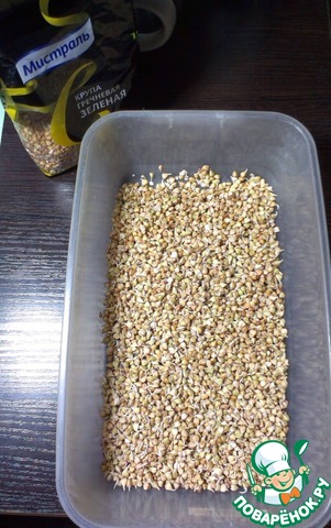 Зелёную гречку промыть под холодной водой, высыпать в стеклянную посуду и оставить на 2 часа. Снова промыть в большом количестве воды несколько раз, поскольку живая гречка слизистая, слить воду через сито. Выложить на широкую поверхность, разровнять тонким слоем. Накрыть марлей, оставив доступ для воздуха. Оставить на ночь до появления ростков, после убрать в холодильник.