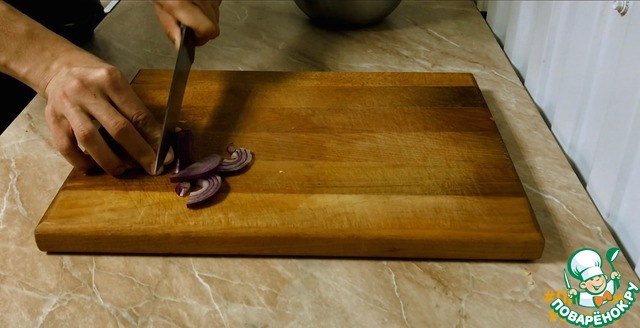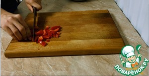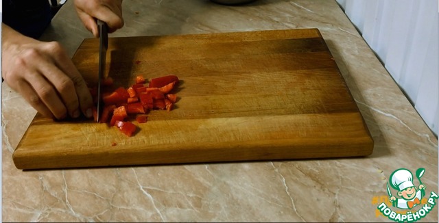 Для начала разрезаем перец, удаляем белую часть перца. Нарезаем его кубиками (размер завит от вашего вкуса, нам нравится побольше).