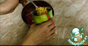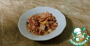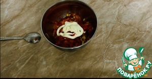 Добавляем 2-3 столовой ложки кукурузы и тщательно всё перемешиваем.