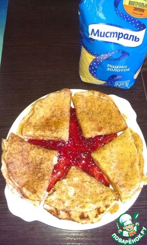 Готовые блины свернуть треугольниками и выложить на тарелку в форме звезды, в серединку налить варенье.