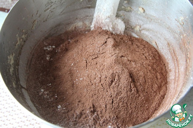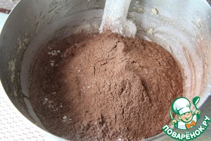 Смешайть муку, соду и соль. Добавить к смеси масла, вместе с какао-порошком и пудингом, просеяв. Перемешайте, пока все полностью не объединится.