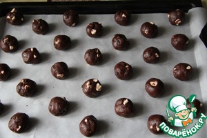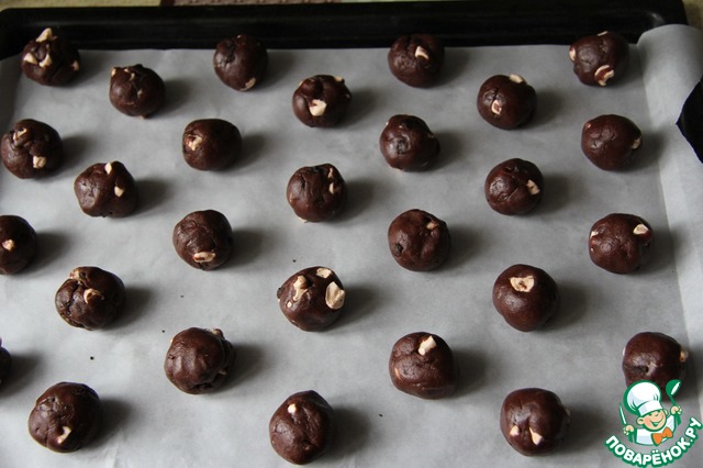 Отрывать кусочки теста размером с большой грецкий орех (я отмеряла на весах по 22-23 грамма), скатывать шариком и укладывать на противень с бумагой для выпечки.