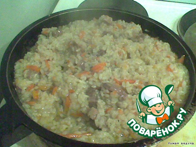 Минут через 10 выкладываем рис и заливаем водой, чтобы она рис покрыла (Не перемешивать!). Закрываем крышку на 20 минут.