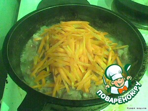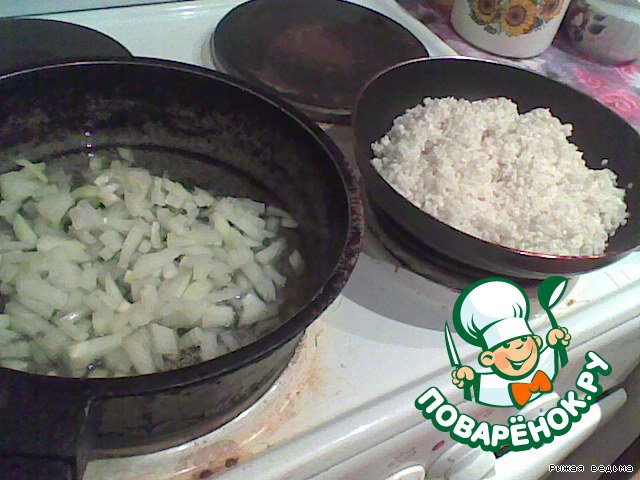 Лук обжариваем в растительном масле до прозрачности (масла не жалеть!), рис просушиваем на сковороде без масла.