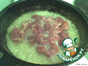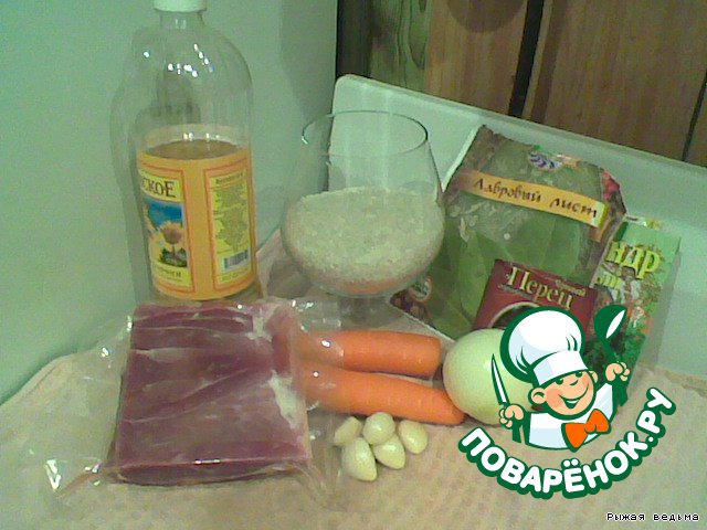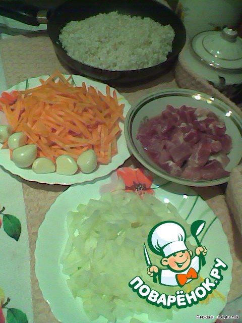 Режем продукты. Морковь соломкой, лук мелкими кубиками, мясо небольшими кусочками. Рис хорошенько промываем.