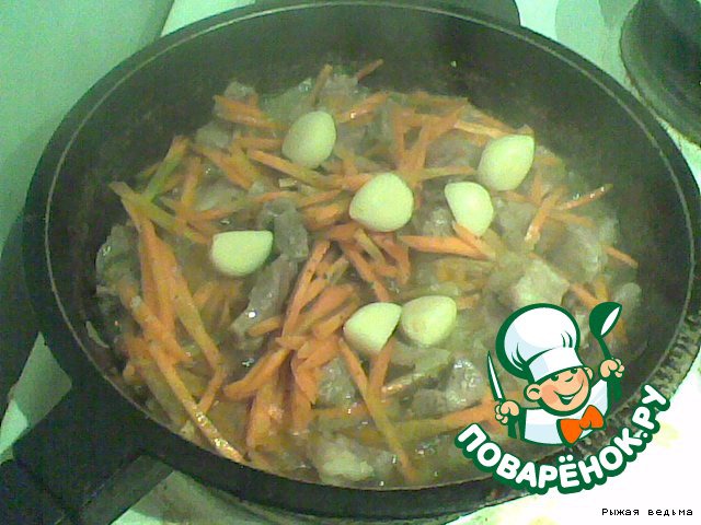 Когда и она обжарится, добавляем чеснок и приправы, солим.