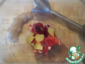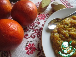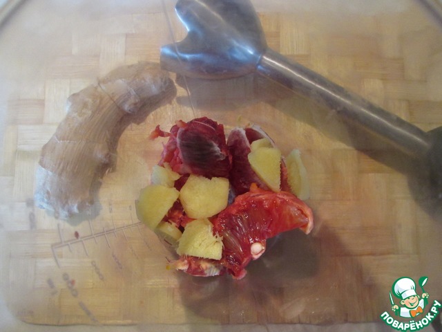 Апельсин (у меня красный) почистить и измельчить в блендере вместе с кусочками имбиря. Водой довести объем полученной смеси до 400 мл.