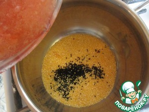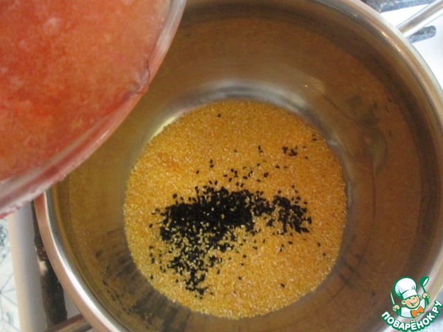 Крупу смешать с сахаром, солью, кунжутом и пряностями, залить смесью из блендера. Варить до готовности.