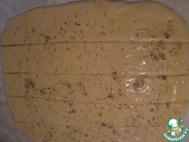 Подошедшее тесто обмять, раскатать в пласт толщиной примерно в 1 см., смазать его ароматным маслом и нарезать на полосы шириной приблизительно 4 см.