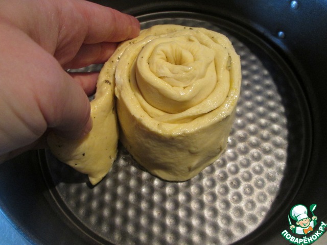 Свернуть первую полоску в рулет и поставить вертикально в форму или на противень, застеленный бумагой. Взять следующую полоску и обернуть вокруг рулета.