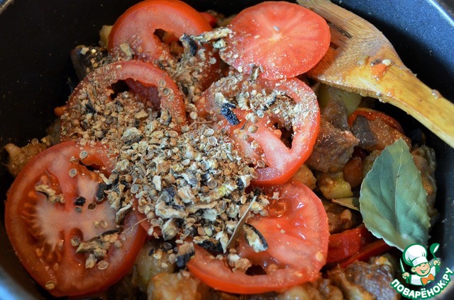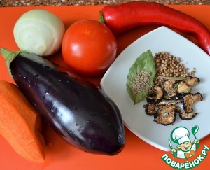 - Специи (1 ст.л. сушеных баклажанов, 2 лавровых листа, щепотка сухих грибов, кориандр и зира) — по вкусу