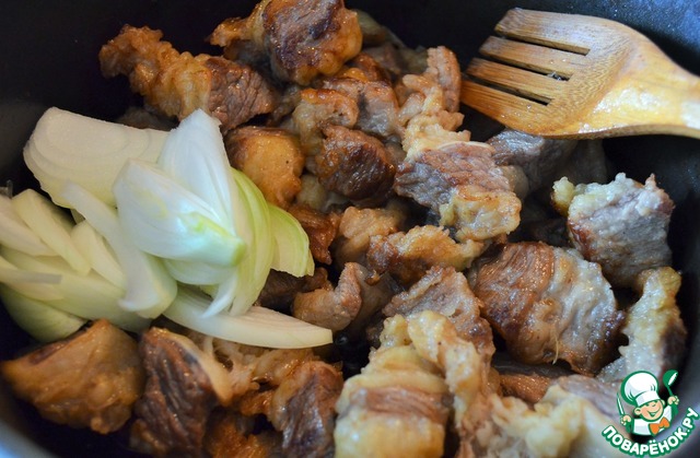 На растительном масле обжарить мясо до красивой корочки.