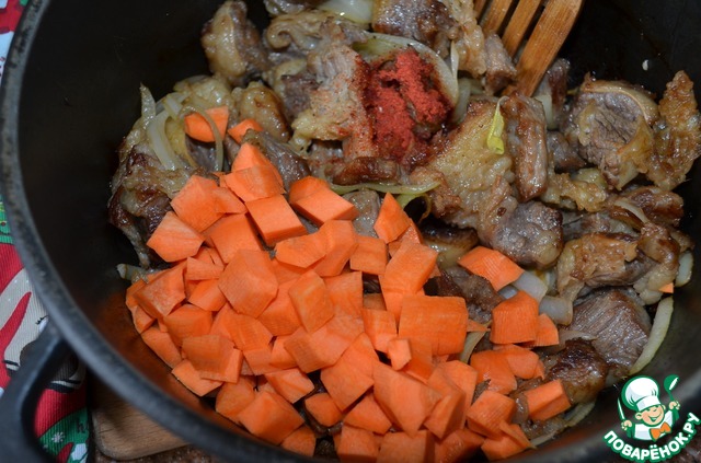 Добавить морковь кубиком и паприку.