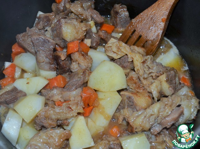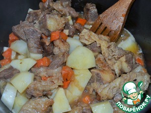 Влить 150 мл кипятка, посолить и протушить мясо на медленном огне минут 30-40, до полного выкипания жидкости.