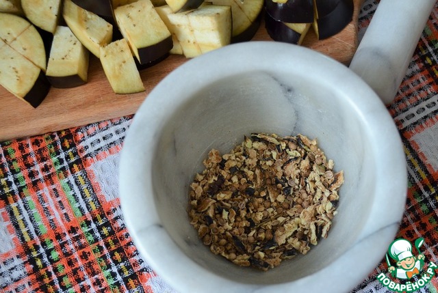 Сушеные баклажаны, грибы и семена измельчить в ступке. -