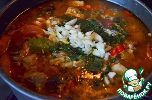 Добавить зелень, рубленый чеснок, сахар.