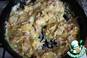 Лук нарезать четверть кольцами. Обжарить на сливочном масле до прозрачности, добавить ветчину, пожарить минуты 2 и влить яйца, все энергично мешать лопаточкой, пока яйца не схватятся.